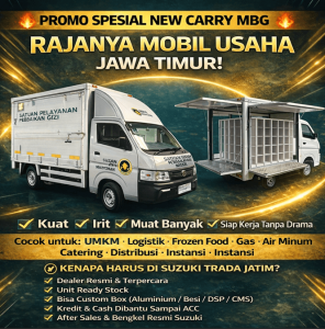 Melalui dealer resmi Suzuki Trada Jatim, promo Suzuki New Carry MBG Jawa Timur tersedia untuk seluruh kota dan kabupaten, dengan unit ready stock dan pilihan custom box sesuai kebutuhan usaha.