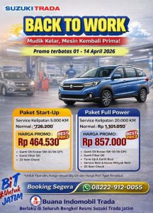 Memasuki bulan April 2026, kebutuhan perawatan kendaraan setelah musim mudik menjadi hal yang sangat penting. Menjawab kebutuhan tersebut, Suzuki Trada menghadirkan program spesial Promo Service “Back To Work” yang berlaku mulai 1 hingga 14 April 2026. Promo ini dirancang khusus untuk memastikan performa mobil Suzuki kembali prima setelah perjalanan jauh.