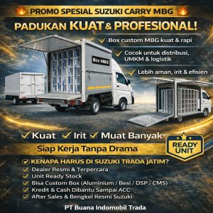 Kabar menarik datang dari dunia otomotif niaga di Jawa Timur. Tahun 2026 menjadi momentum penting bagi pelaku usaha, khususnya UMKM, distribusi, hingga logistik, dengan hadirnya Promo Spesial Suzuki Carry MBG yang kini semakin diminati di berbagai kota seperti Surabaya, Sidoarjo, Gresik, Malang, Blitar, Kediri, Tulungagung, Banyuwangi, Jember, Probolinggo, Pasuruan, Mojokerto, Lamongan, Bojonegoro, Tuban, hingga Madura (Bangkalan, Sampang, Pamekasan, Sumenep).