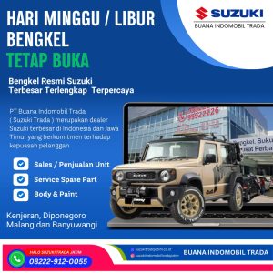 Apakah Anda sering kesulitan mencari bengkel mobil Suzuki terdekat saat hari Minggu atau hari libur? Kini Anda tidak perlu khawatir lagi, karena Bengkel Resmi Suzuki Buana Indomobil Trada (Suzuki Trada Jatim) hadir memberikan layanan terbaik dengan jam operasional tetap buka meskipun hari Minggu dan tanggal merah.